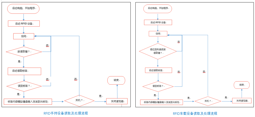 经调研,伟德BETVLCTOR基本确定了汇鸿RFID设备接口程序功能需求,并分别制定了基于手持和车载设备的数据处理流程:
